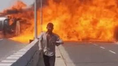 तेल टैंकर पलटते ही लगी आग, लपटों में घिरा 200 मीटर इलाका