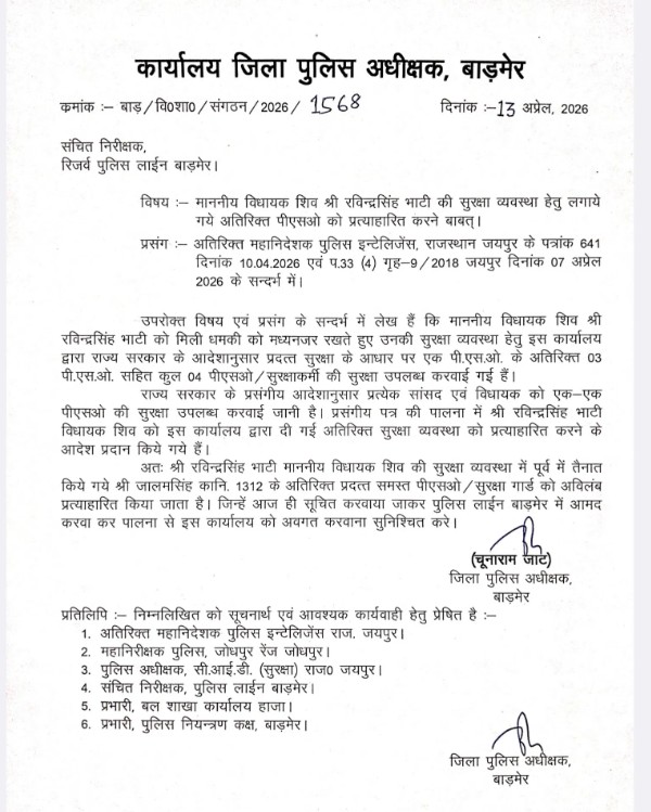 बाड़मेर | बाड़मेर की शिव विधानसभा सीट से निर्दलीय विधायक रविंद्र सिंह भाटी की सुरक्षा में अचानक की गई कटौती ने राजनीतिक हलकों में हलचल पैदा कर दी है। उनकी सुरक्षा में तैनात चार जवानों में से तीन को हटा लिया गया है, जिसके बाद अब उनके पास केवल एक पीएसओ (PSO) बचा है।
