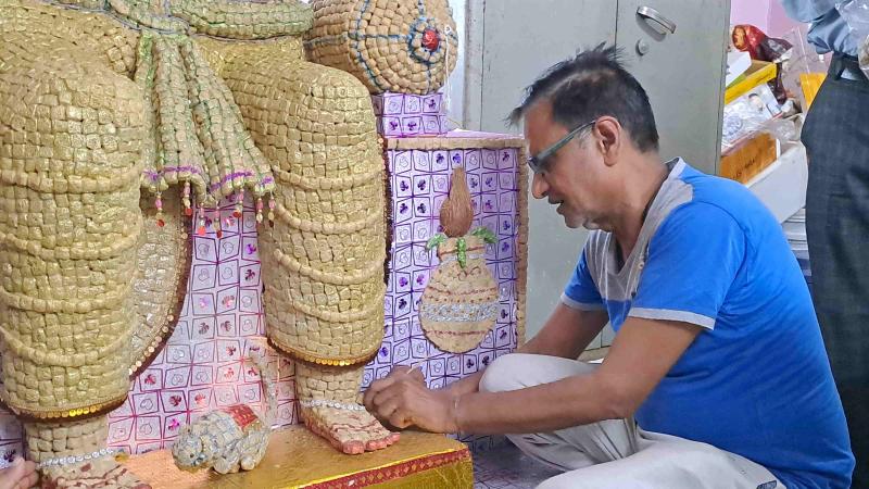 उन्होंने बताया कि, ''वह पूर्व में बूंदी, दाल, मखाना, नमकीन सेब, मक्का, धनिया, साबूदाना, लड्डू, चना, गरी, मूंगफली, नारियल एवं मुरमुरा सहित अन्य वस्तुओं से प्रतिमाओं का निर्माण कर चुके है. जो आकर्षण का केंद्र तो रही साथ ही पर्यावरण को सुरक्षित रखने का भी प्रयास किया गया.''