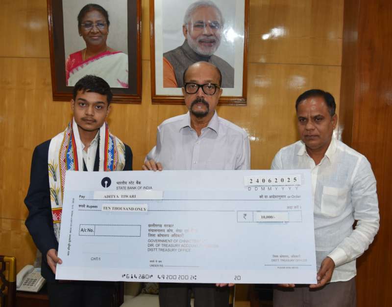 रायपुर :  राज्यपाल रमेन डेका ने आज यहां राजभवन में बेमेतरा जिले के मेधावी छात्र आदित्य तिवारी का सम्मान किया। राज्यपाल डेका ने छात्र को 10 हजार रूपए की प्रोत्साहन राशि प्रदान की, साथ ही राजकीय गमछा एवं स्मृति चिन्ह भेंट किया। डेका ने छात्र के उज्ज्वल भविष्य के लिए शुभकामनाएं दी।