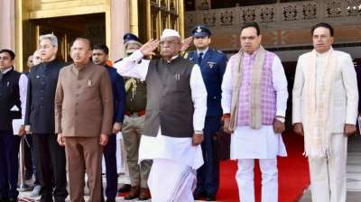 विधानसभा के मुख्य द्वार पर राज्यपाल बागडे को आरएसी बटालियन द्वारा सलामी दी गई